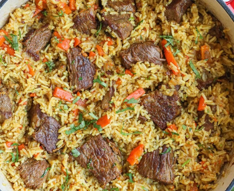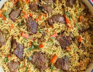 This one-pot beef and rice is fragrant, hearty, and full of Middle Eastern-inspired flavors. Tender beef chunks, aromatic spices, basmati rice, and vegetables all simmer together in one pot for a comforting, well-balanced meal that's both simple and satisfying..