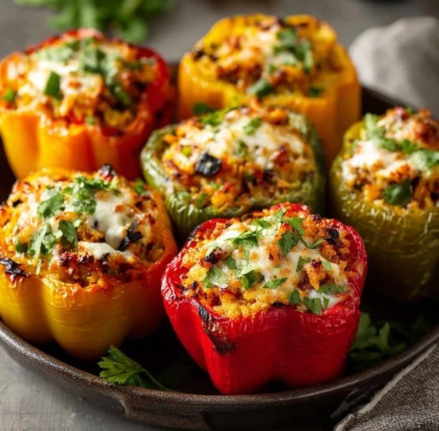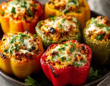 These vegetarian stuffed peppers are hearty, colorful, and packed with wholesome flavor. Filled with a mix of seasoned rice, lentils, vegetables, and melted cheese, they're perfect for a wholesome dinner that feels comforting but light.